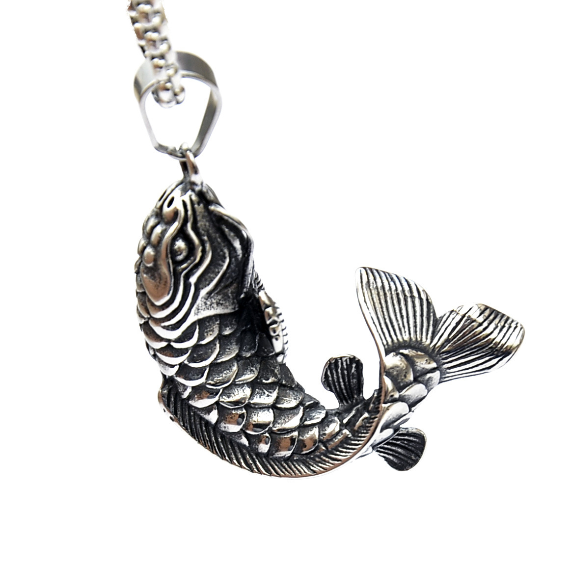 Ce pendentif représente un poisson Koï ou carpe Koï en plein mouvement, comme s’il venait d’être pêché. Toutes les écailles du corps ainsi que les nageoires sont mises en valeur par l’acier qui le compose. Le poisson Koï est un porte-bonheur en Extrême Orient : il représente la force et l’amour.