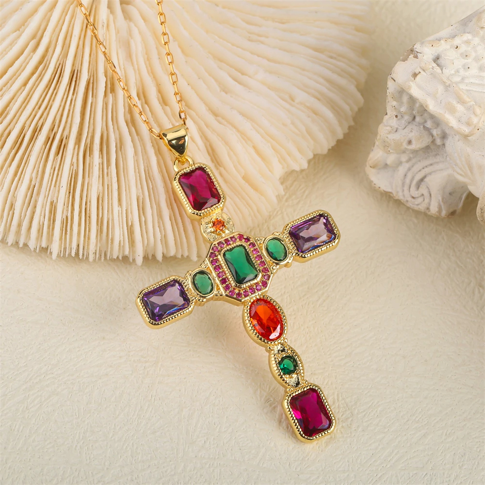Portez ce pendentif croix multicolore pour afficher une palette de convictions aussi diverses que les pierres qui le composent. Incrustée dans un cadre en cuivre doré, chaque pierre apporte sa propre énergie et couleur, offrant non seulement un accessoire de mode, mais aussi une amulette de diverses vertus spirituelles.
