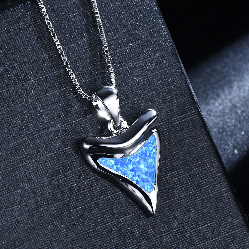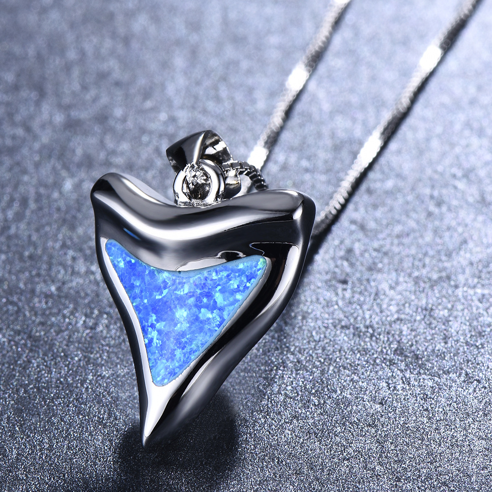 Ce magnifique pendentif est en forme de dent de requin qui représente la force de la nature et la confiance en soi. Le design simple et élégant de ce bijou capture parfaitement la symbolique de force : la pierre d’opale au centre, blanche ou bleue, renforce encore le symbole de protection.