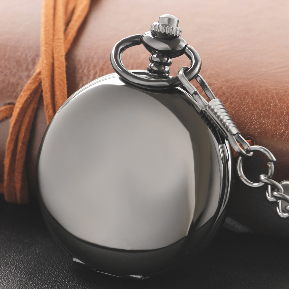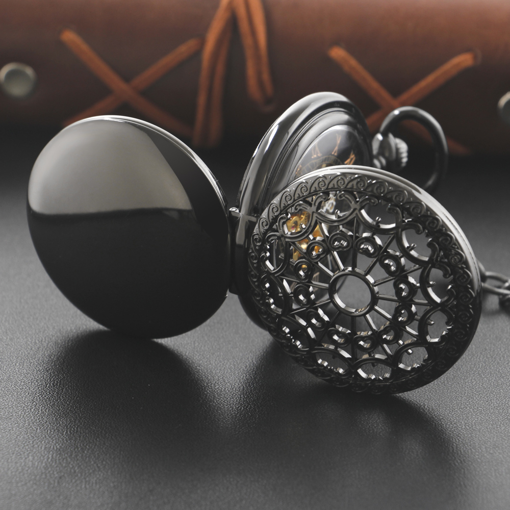 Ce pendentif montre de poche ou à gousset noire est en acier inxydable donc très résistant et la fenêtre du cadran est en acrylique. Le remontoir est mécanique, comme les anciennes montres et convient très bien à son look vintage. La montre fait 5 cm de diamètre et la chaîne assortie est proposée avec son mousqueton.