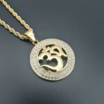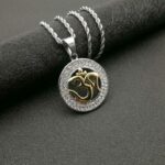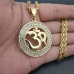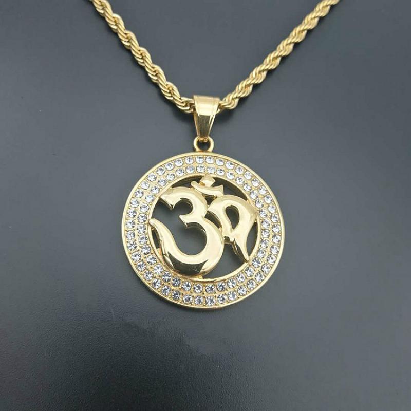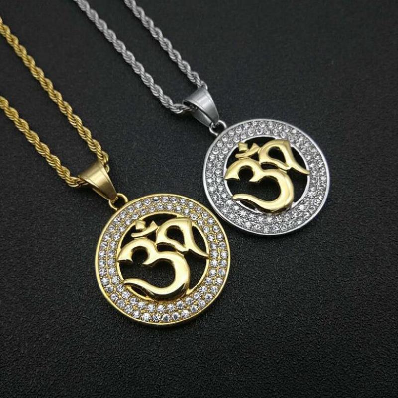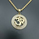 Ce pendentif rond en alliage de zinc de haute qualité représente un cercle de métal argenté ou doré serti de zircons sur toute sa surface. En son centre évidé on trouve le symbole Om en lettres dorées sur les deux couleurs de pendentifs : les lettres sont en relief. Il est agrémenté d’une jolie chaîne torsadée assortie.