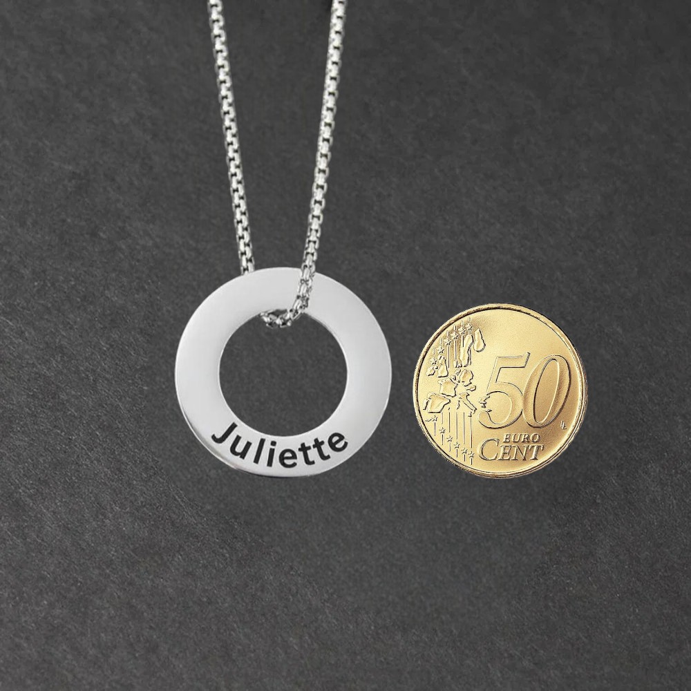 Il suffit parfois d’un mot, d’un prénom, pour recentrer. Ce pendentif vous le rappelle à chaque fois que vous le touchez ou que vous l’enfilez. L’acier inoxydable poli reste brillant dans le temps, et la gravure est nette, lisible, sans fioritures.