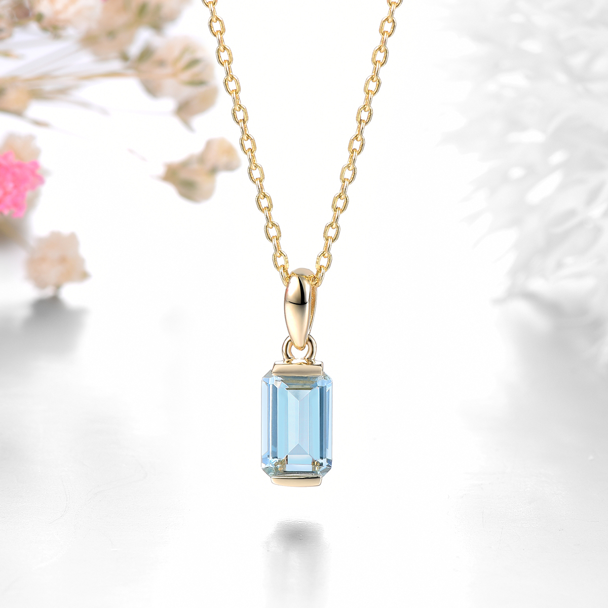 Ce pendentif est en or jaune 9 carats et en pierre précieuse d’aigue-marine, ce qui en fait un bijou luxueux et très beau. La pierre est taillée en forme octogonale de manière à donner un effet de profondeur à cette petite aigue-marine qui du coup paraît plus importante. L’or a été plaqué de rhodium pour plus de douceur.