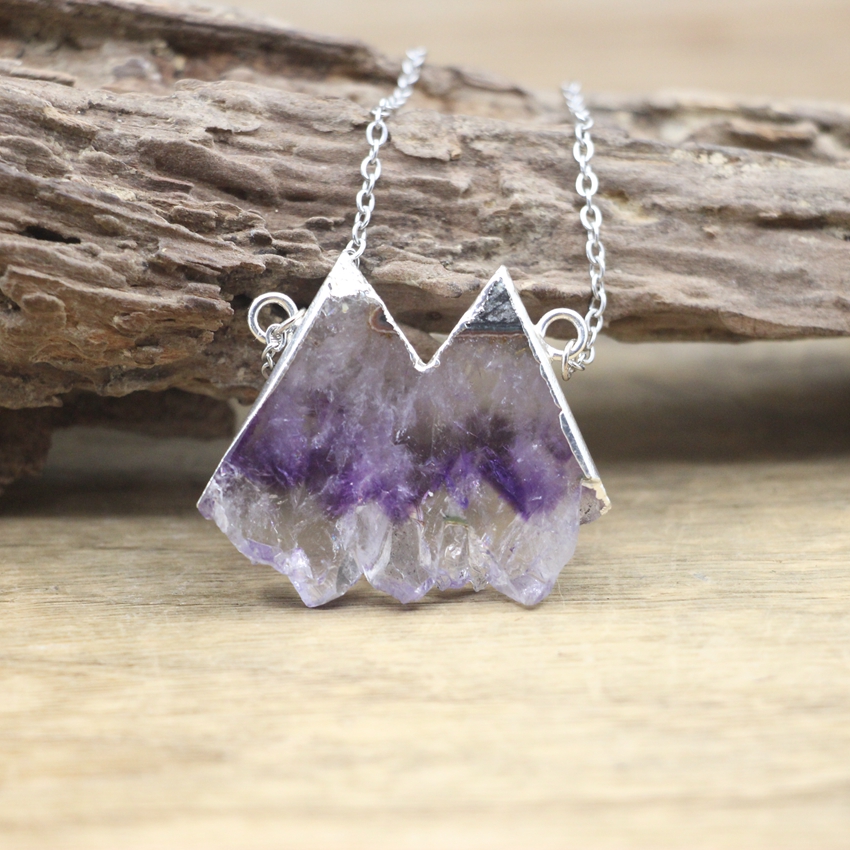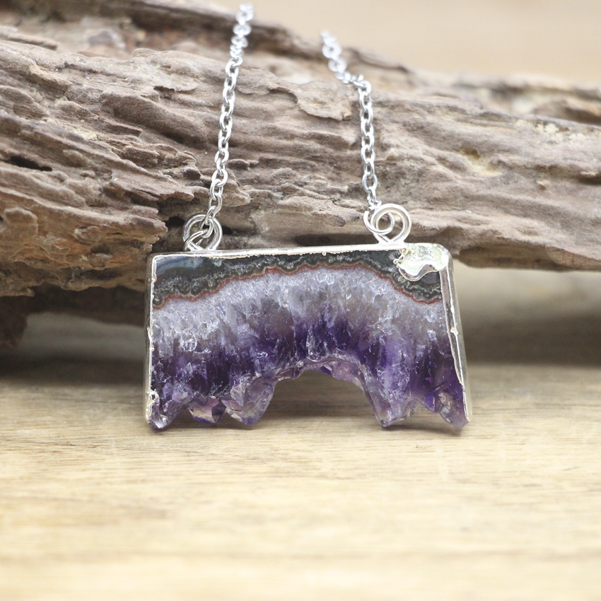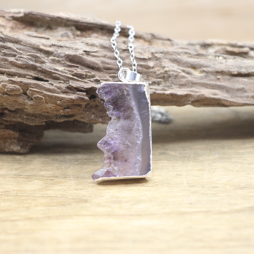 Notre pendentif en forme de plaque d’améthyste est vendu avec une chaine couleur argentée d’environ 50 centimètres de longueur. Cela vous permettra de porter ce pendentif directement après l’avoir reçu. Cependant, vous pourrez échanger la chaine avec une de votre collection afin d’avoir la longueur parfaite et de mettre le bijou le mieux possible en valeur autour de votre cou.