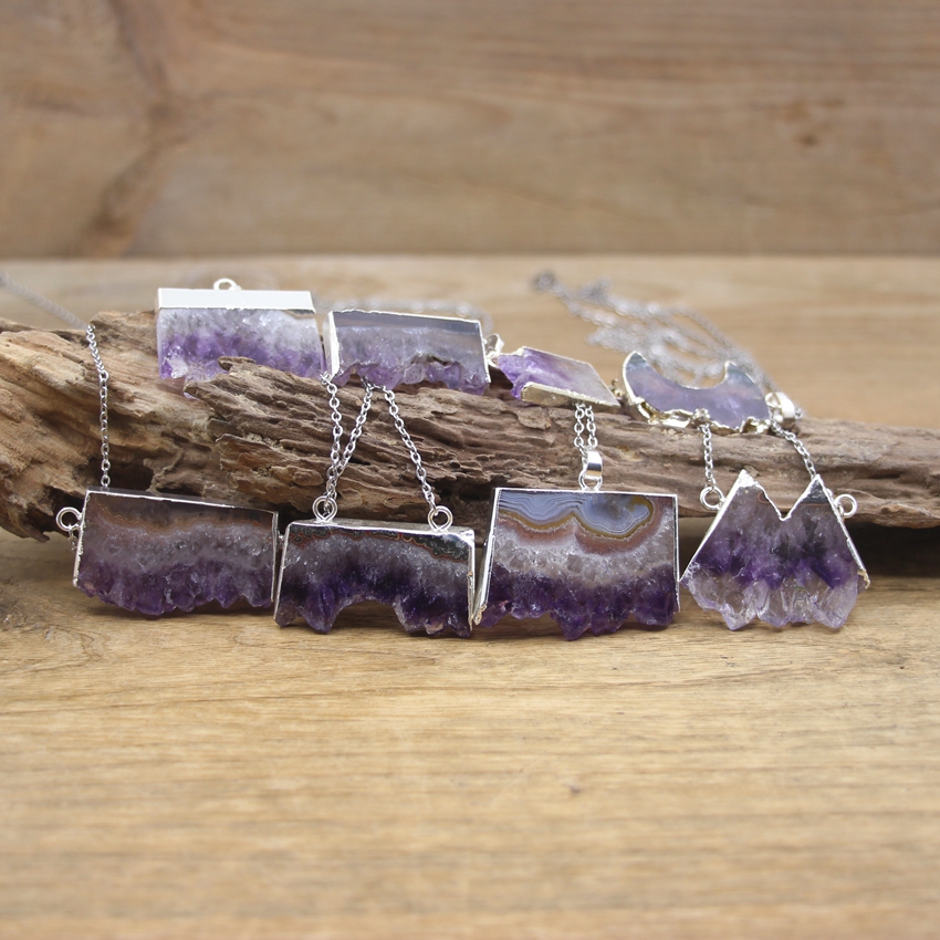 Découvrez nos nombreux modèles de plaques d’améthystes différents. En faisant défiler les différentes tailles, vous verrez apparaitre des modèles de tailles et de formes différentes. A vous de choisir le modèle qui correspondra le mieux à vos goûts et votre personnalité. Dans le doute, référez-vous au guide des tailles personnalisé du produit pour y trouver les dimensions exactes de chaque pendentif.