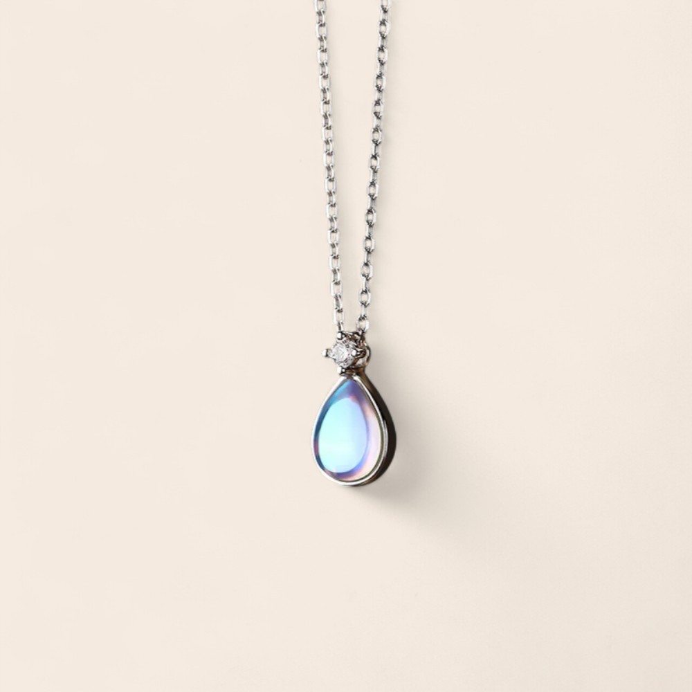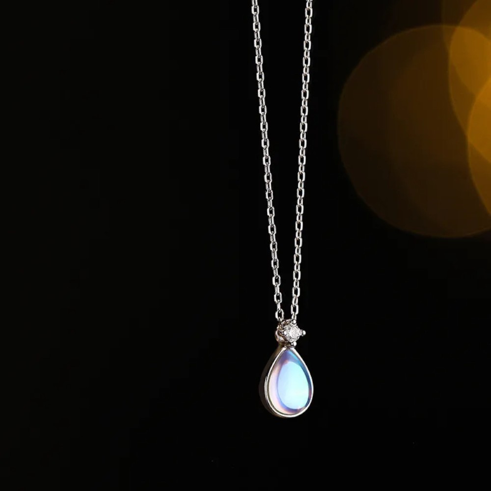 Ce collier délicat en argent avec pendentif en pierre de lune va vous séduire par sa lumière douce et changeante. La pierre en forme de goutte, sertie sous un zircon discret, capte la lumière et révèle des reflets bleutés aux nuances subtiles.
