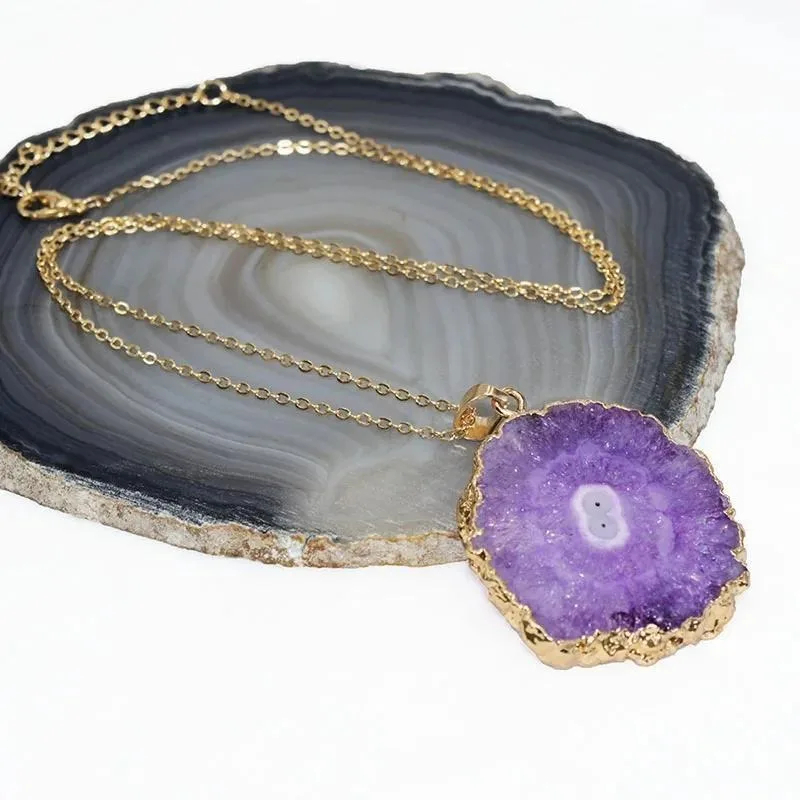 Portez ce pendentif en agate pour un impact visuel immédiat. La pierre naturelle offre des nuances vibrantes de violet et de bleu, polies pour maximiser leur éclat. La chaîne dorée complète parfaitement le pendentif, ajoutant une touche de luxe et d’élégance à n’importe quelle tenue.