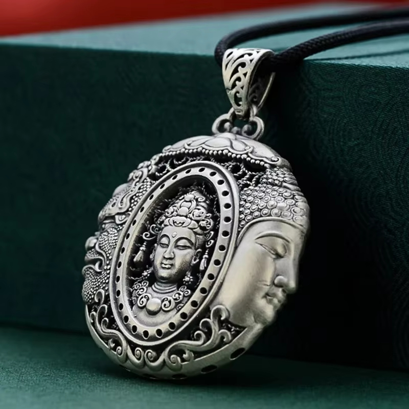 Chaque détail du pendentif religieux est finement sculpté, de la sérénité du visage du Bouddha à la dynamique du dragon. Conçu en métal argenté, il offre une brillance sobre qui s’accorde parfaitement à tous les styles. Sans chaîne ni cordon, il peut être porté selon vos préférences, que ce soit autour du cou ou en tant qu’amulette à garder près de soi. Ce bijou est à la fois symbolique et élégant.
