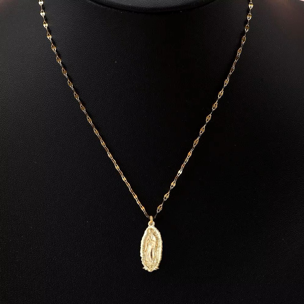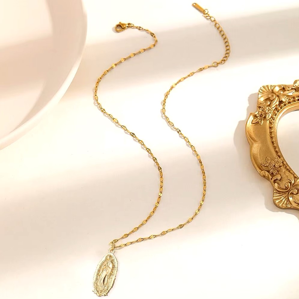 Ce pendentif religieux est fabriqué en acier inoxydable avec une finition dorée brillante, garantissant une brillance durable. Sa chaîne de 40 cm repose délicatement autour du cou, offrant une belle visibilité tout en restant subtile. Le design léger permet un port confortable, tandis que la finition dorée ajoute une touche d’élégance et de sophistication. Parfait pour un usage quotidien ou pour des occasions spéciales.