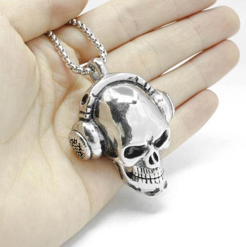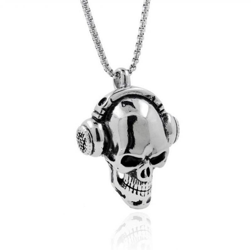 Ce pendentif et sa chaîne en forme de tête de mort surmontée d’un casque audio est un bijou dit gothique, mais punk rock serait tout aussi bien pour le définir pour la connotation musicale ou encore hard rock. La signification est ici plutôt drôle et bien trouvée, l’originalité du produit et sa qualité en font un beau bijou.